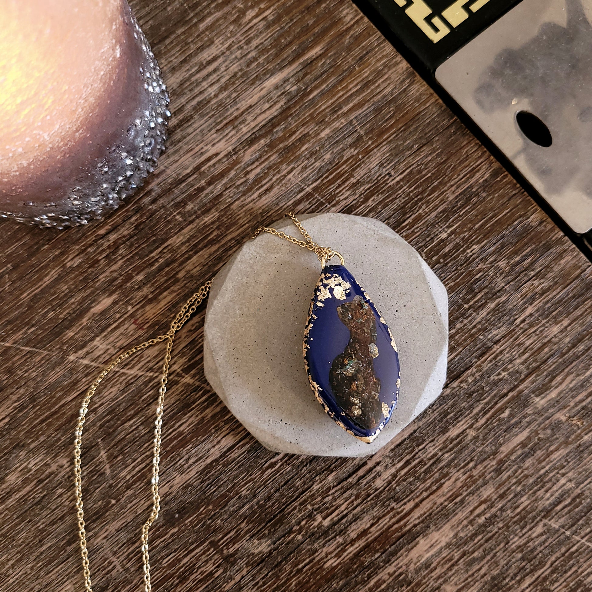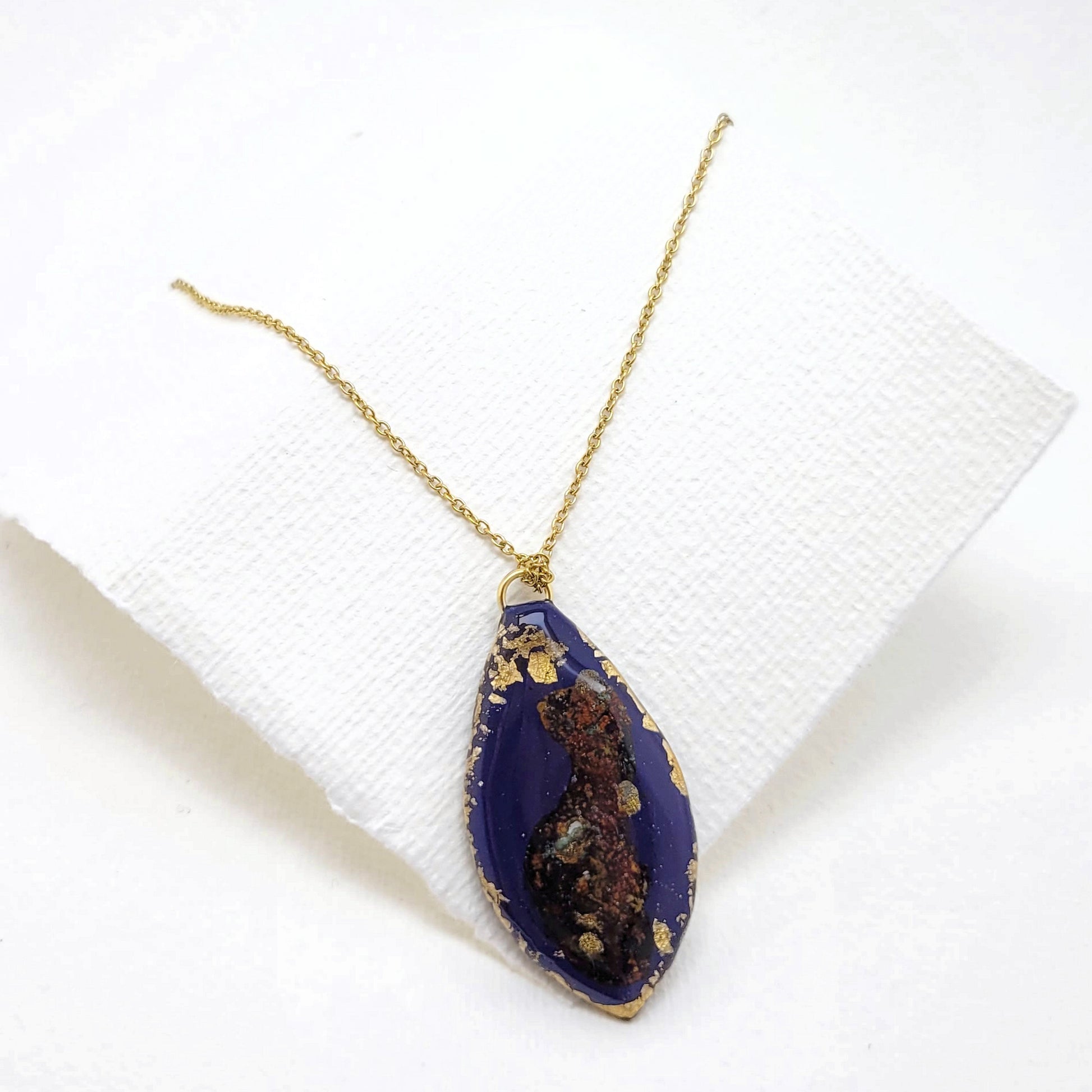Anhänger mit echter Rostpatina und 23,6 Karat Blattgold an goldener Kette